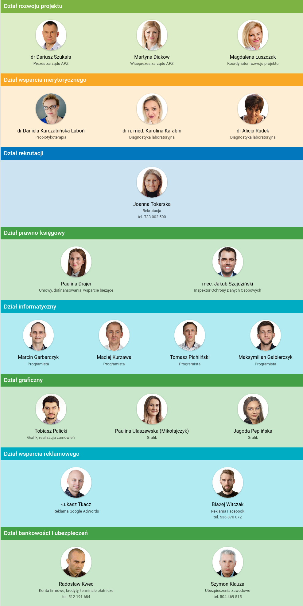 Na wyniki każdego dietetyka w naszym projekcie pracuje cały zespół osób specjalizujących się w ściśle określonych działaniach. To właśnie dzięki połączeniu sił całej grupy specjalistów, każdy dietetyk może nie tylko czuć się bezpiecznie w naszym projekcie ale także w bardzo szybki sposób rozwijać się zawodowo i finansowo. Poniżej prezentujemy nasz aktualny zespół wsparcia zawodowego który kompleksowo rozwiązuje wszystkie ZADANIA pozwalające dietetykom skutecznie zaistnieć w zawodzie: